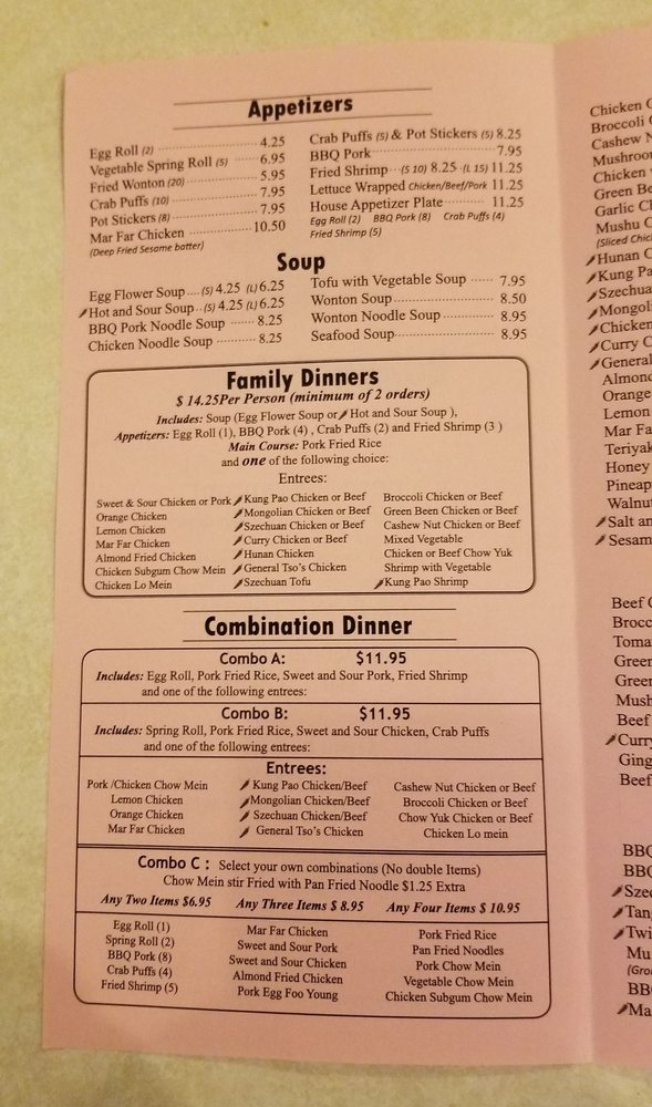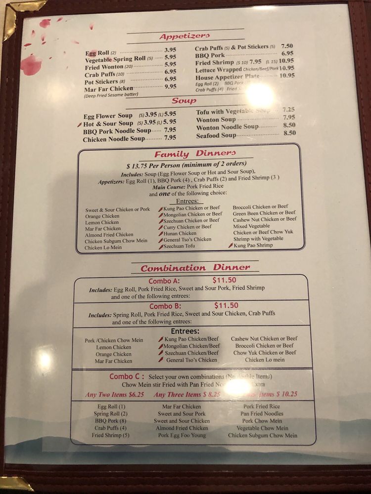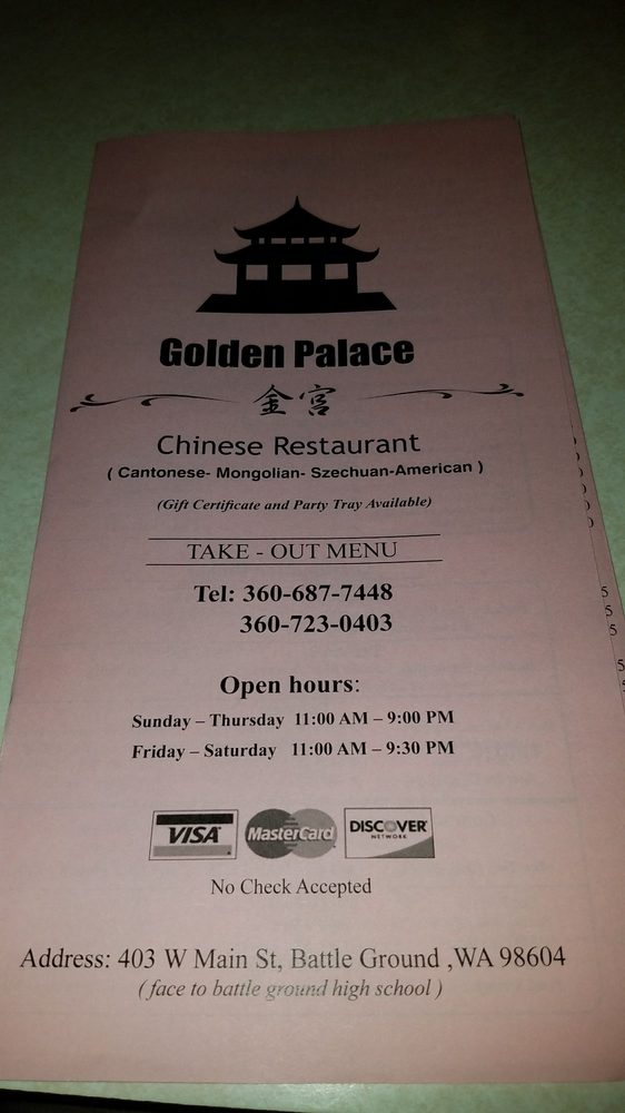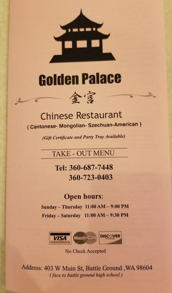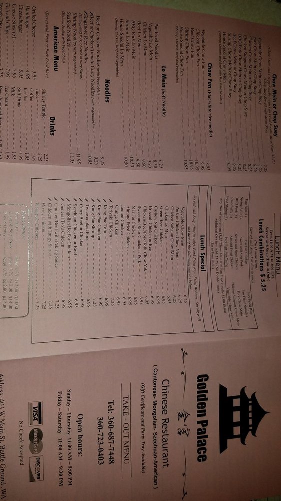 Introducing the menu at Golden Palace, a Chinese restaurant in Battle Ground, WA, offers a wide selection of dishes with many vegetarian options. The restaurant provides takeout, reservations, delivery, and accepts credit cards. Known for its delicious food and efficient service, Golden Palace has received positive reviews from customers. Dishes like General Tso chicken, chicken lo mein, sweet and sour chicken, crab puffs, and pot stickers have been highlighted for their flavors and generous portions. The friendly and accommodating staff contribute to the overall dining experience. With ample parking, outdoor seating, and a casual ambience, Golden Palace is a great spot for groups, kids, and families looking for quality Chinese cuisine in the area.